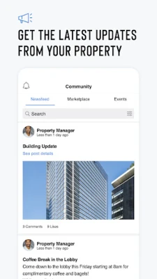 • Amenity Access • Visitor registration • Management and staff interaction • Service request submittal and management • Building announcements